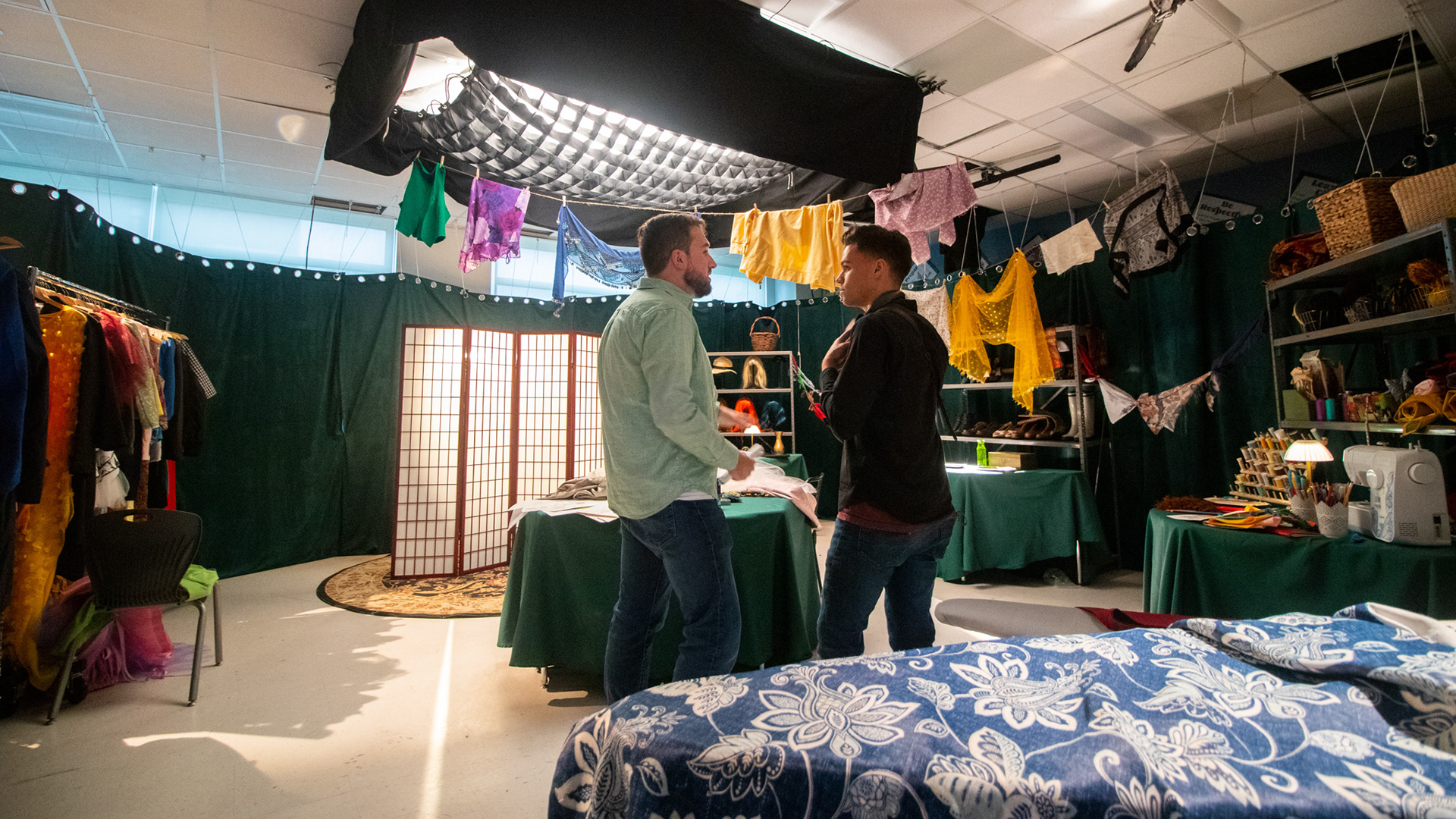 This show follows the main character through 5 locations that all had to be completely altered. We go back and forth between dream sequences and real life. We covered 130 feet of the hallway that followed into a costume room that we converted from a classroom. The other dressing room was also converted from a storage closet.